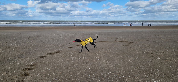 Et quelle plage ! Immense, large et sablonneuse, elle offre un terrain de jeu idéal pour un lévrier comme Vaïka, qui a pu s’élancer à pleine vitesse en toute liberté. Autour de nous, de nombreux autres chiens, petits et grands, partageaient le sable avec familles et promeneurs dans une atmosphère paisible et bienveillante.